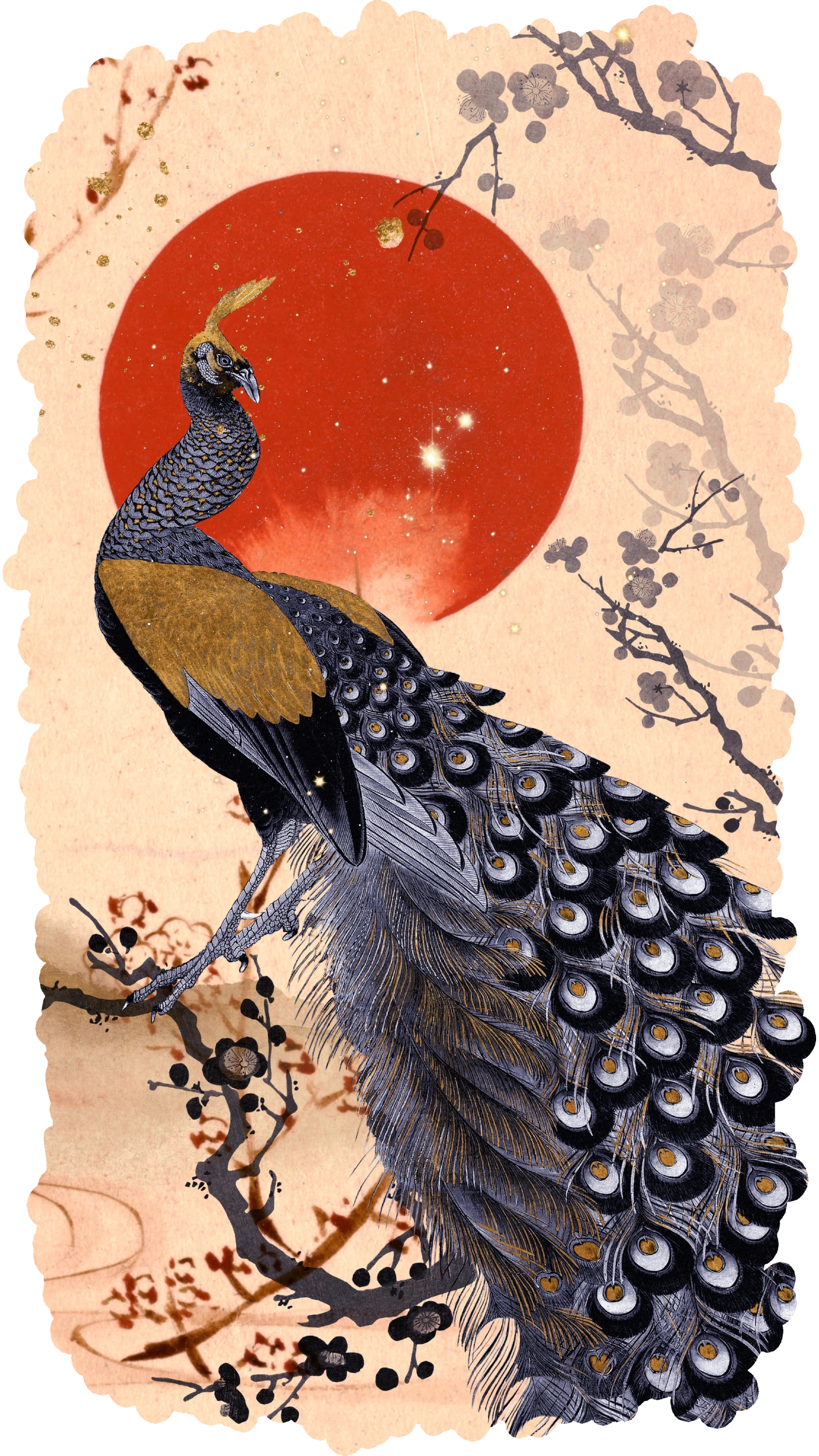 Under a rising red moon, a peacock stands in quiet majesty - midnight blues brushed with gold, tail feathers blooming into a galaxy of eyes. Celestial Peacock feels like a silk print come to life: fine inked branches, soft-paper warmth, and starry flecks to delight the patient eye. As you place each feathered “constellation,” the scene gathers a calm, ceremonial glow until the final click - ready to keep on display.