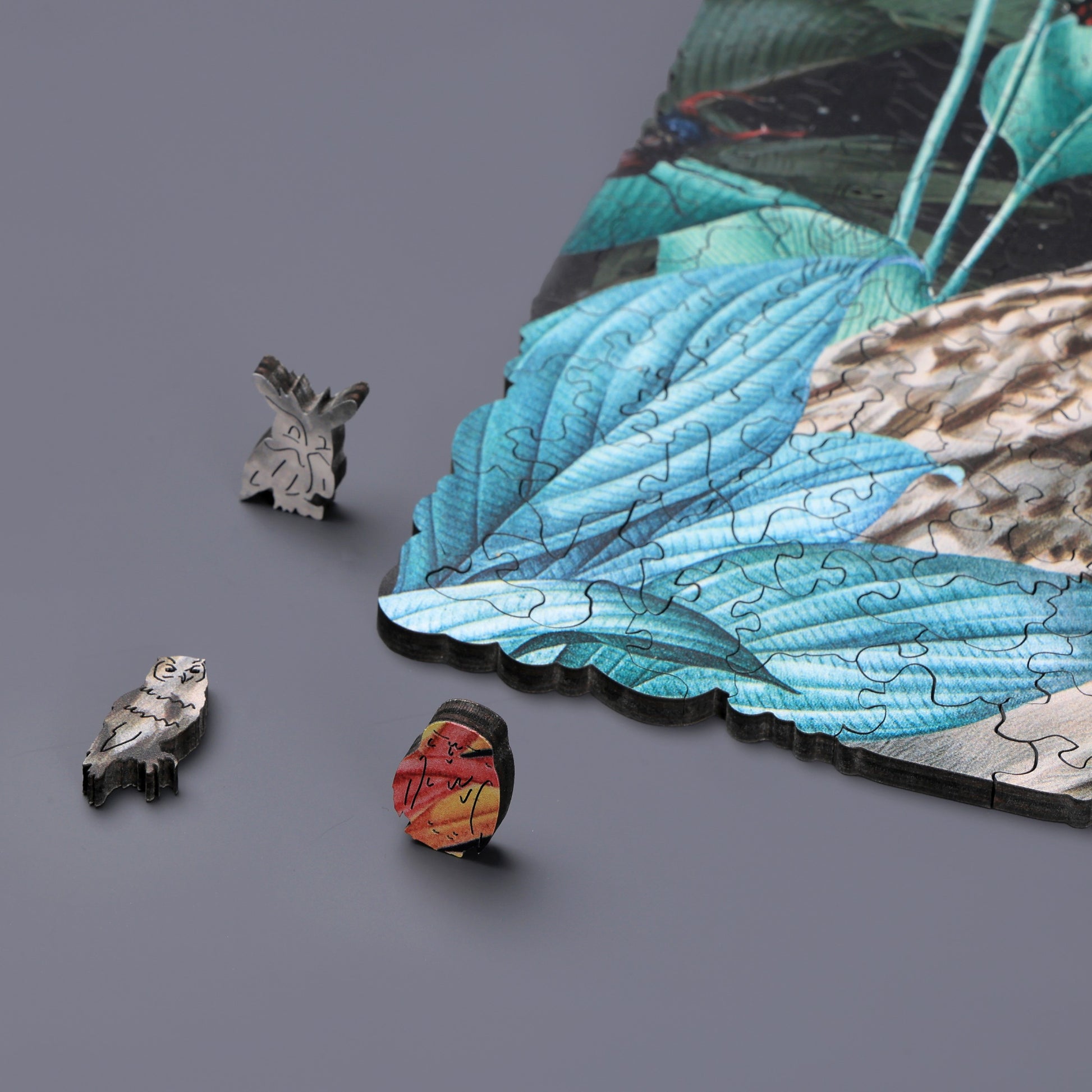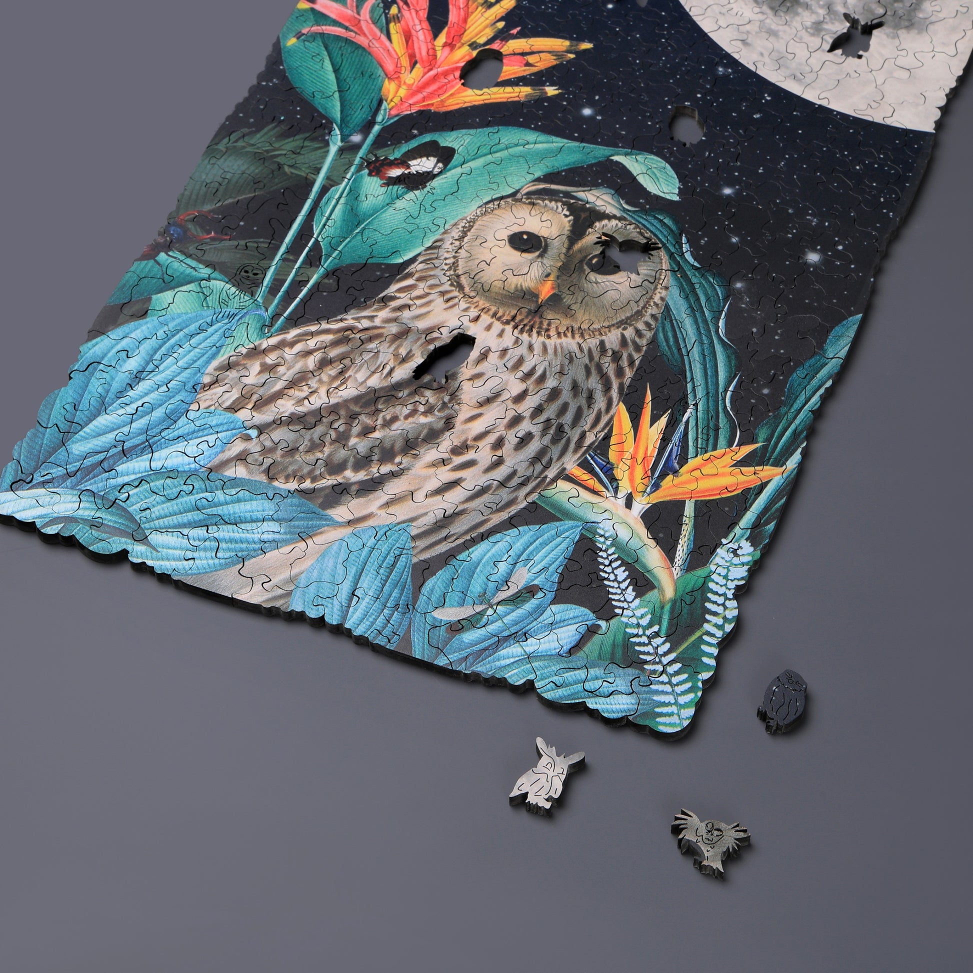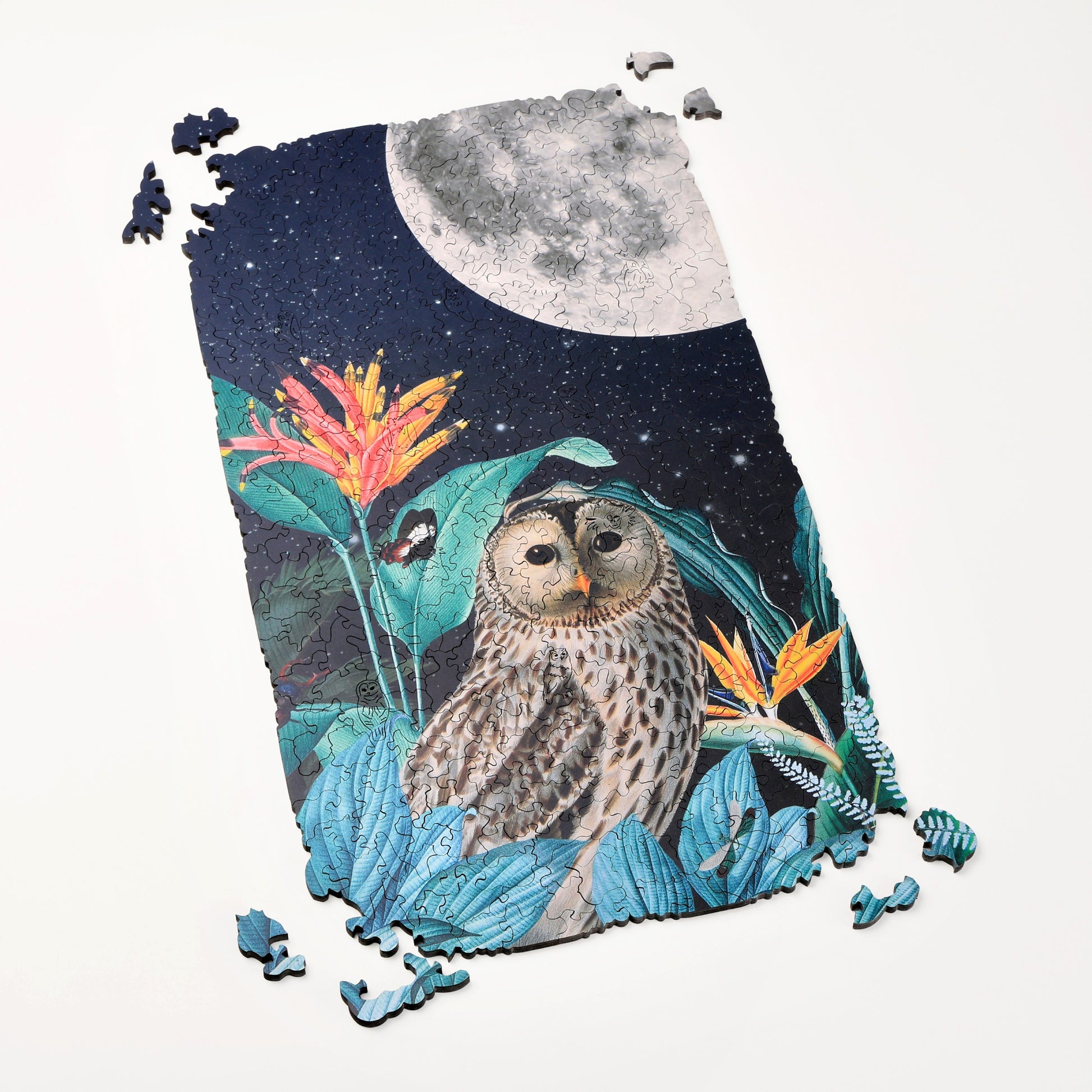 A quiet guardian holds the night. Under a velvet sky, a full moon drifts above tropical leaves while a watchful owl meets your gaze. Petals glow, a butterfly pauses, a dragonfly rests - small, tender details that appear as the pieces come together. Cool moonlight blues and soft silvers meet warm florals for a calm, contemplative build with a gentle rhythm. When the last click settles, it’s the feeling of the night exhaling - an image you’ll want to keep on display.
